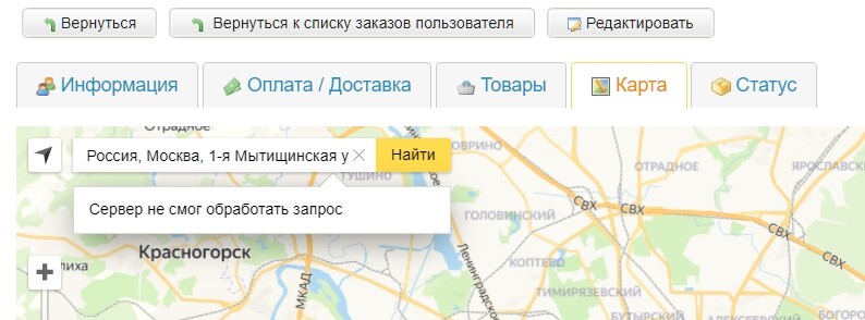 В админке появилась гугл-карта, не знаю ее назначение, но при попытке найти адрес покупателя на карте выдает ошибку- Сервер не смог обработать запрос.