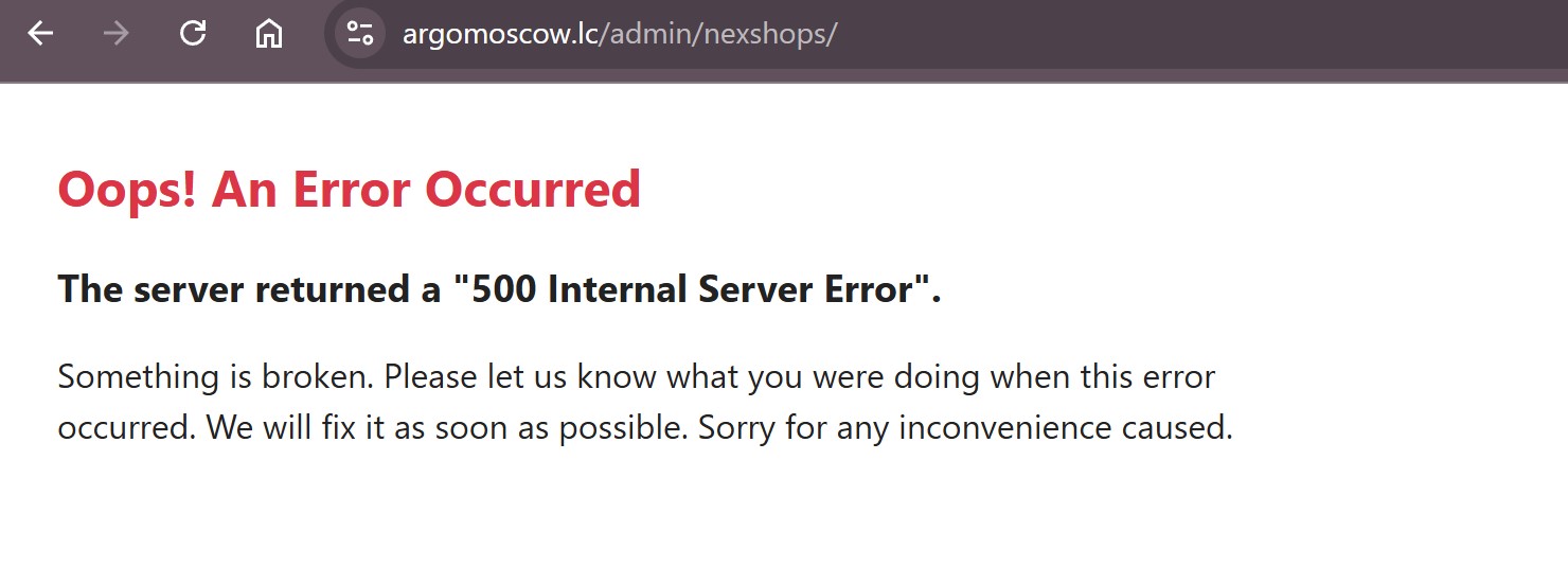 ошибка была в том что прописано в .htaccess В админке- но опять же, в обычную админку зашел, а вот в админку nexoos там уже новая ошибка- причем со скриншотом..