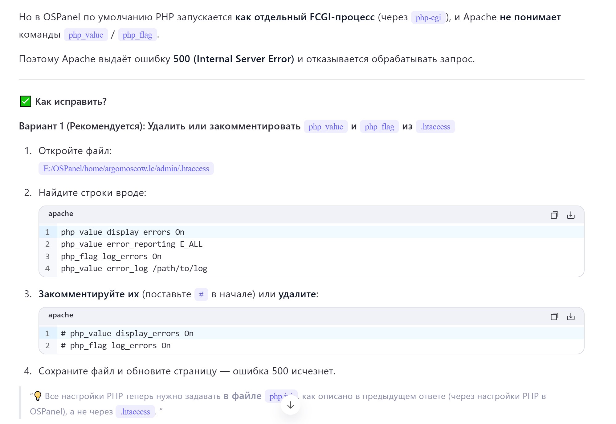 Это означает, что в файле .htaccess (в папке admin вашего сайта) используется директива php_value, но Apache в вашей конфигурации OSPanel работает с PHP через FCGI (FastCGI), а не через модуль mod_php 1