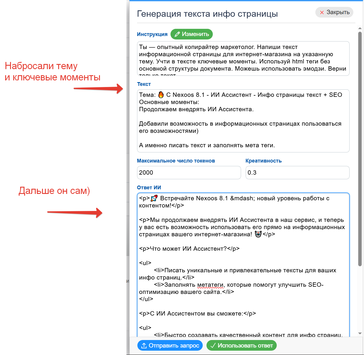 - Быстро создавать качественный контент для инфо страниц.